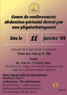 Tous les mardis à 15h, je donne un cours de renforcement abdomino-périnéal à BoulevardSanté. Descriptif du cours ?